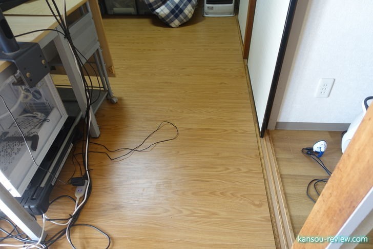 和室が見事洋室に変わりました。施行方法は前述したように、1枚の大きな板がくるくる丸まっている物を広げて敷くだけなので簡単ですが、部屋の中をいったん全部出さなければならないのは大変でした。特にPCなどを置いてある部屋で、配線も複雑だったので、そんぽバラシと復旧にだいぶ時間がが掛かってしまいました。
